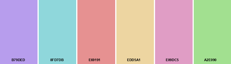 - Pastel Paradise: #B79DED, #8FD7DB ,#E69191, #EDD5A1, #E09DC5, #A2E090
